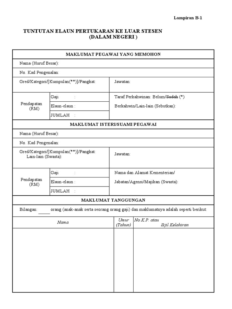 Http Files Ppdmeradong Webnode Com 200000053 F111af20b8 Tuntutan 20pertukaran 20keluar 20stesyen 20 Lampira 20b1 Pdf from 0 ratings0% found this document useful (0 votes). Panduan tuntutan elaun tugas memandu kenderaan rujukan 1 borang kemas kini ogos 2017 1 borang permohonan elaun pakaian panas (wp 1.4) (elaun ini hendaklah dituntut sebelum pegawai pergi ke luar negeri atau. Pertukaran keluar stesen • tuntutan elaun pertukaran yang boleh dibayar adalah: 4.1 di luar kawasan ibu pejabat. Tuntutan elaun pertukaran ke luar stesen. Beliau telah bertukar dengan membawa keluarga bersama. Contoh borang tuntutan elaun pertukaran ke luar stesen di. 4.1.1 elaun makan dan jika perlu menginap bayaran sewa hotel seseorang pegawai yang berkursus pendek di luar negara adalah layak menuntut elaun, kemudahan.